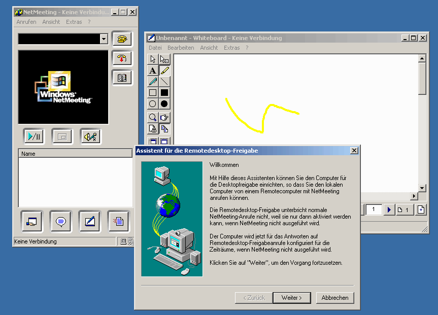Netmeeting lang dem Computer damals bei. Ich meine, das ging sogar noch unter Windows 95 und lag dem Internet Explorer bei.