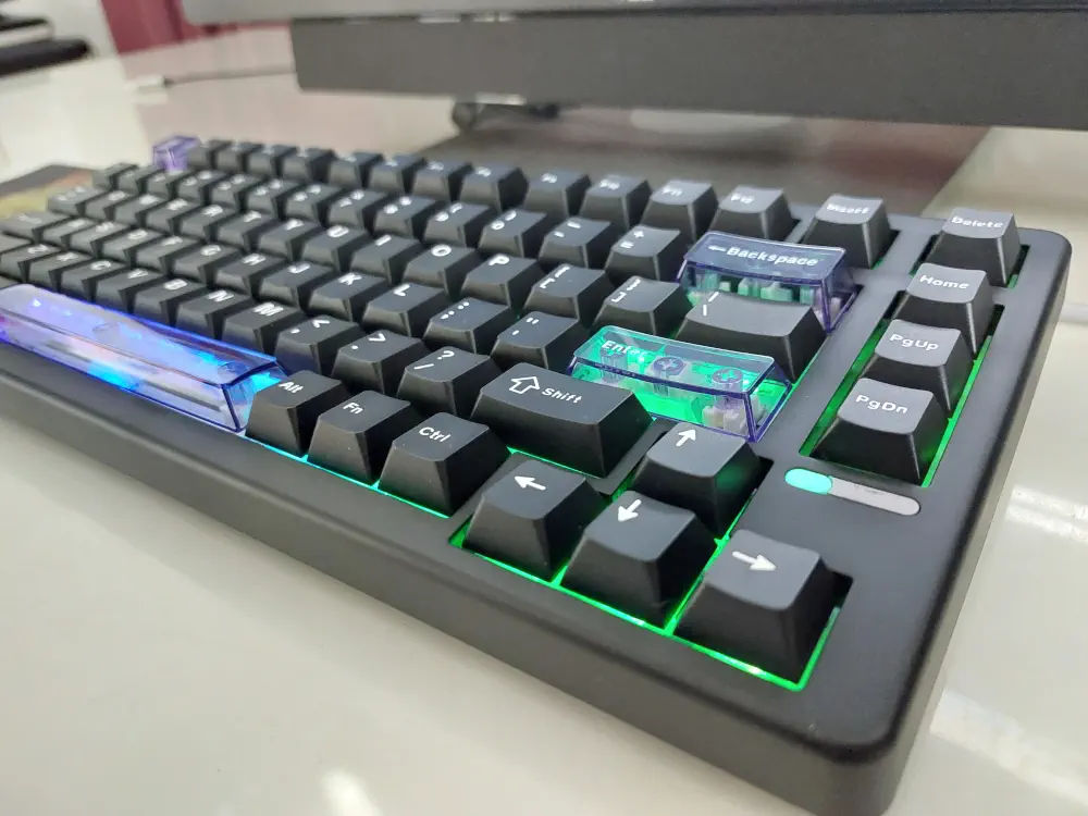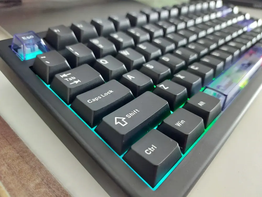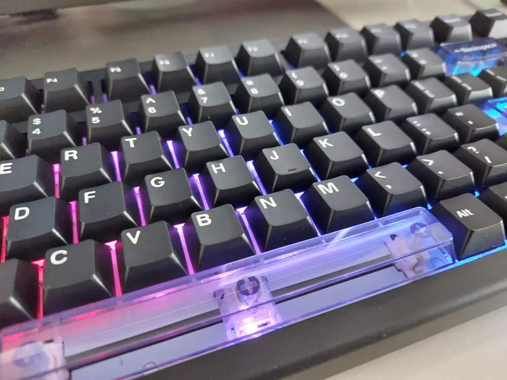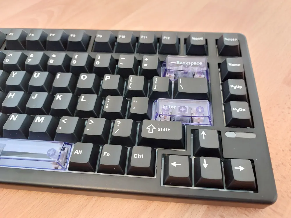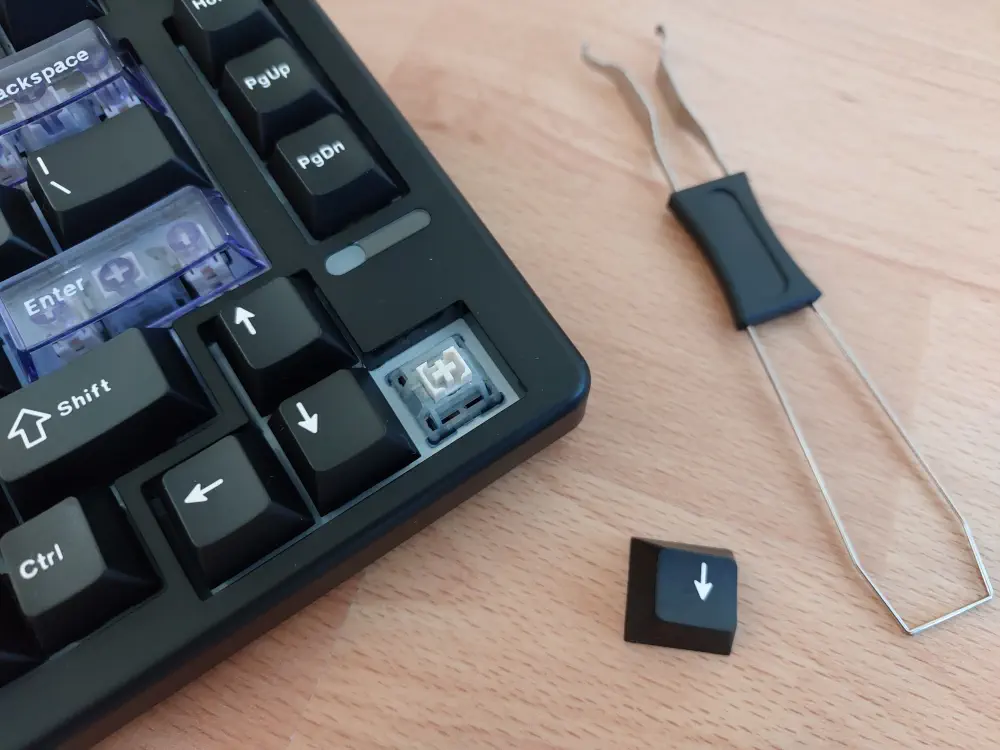 Einige Tasten sind durchsichtig, wem das nicht gefällt, kann diese mit den beigelegten schwarzen Key-Caps austauschen. Ein Werkzeug liegt bei, dieses erlaubt auch den Wechsel einzelner Switche. Drei Ersatzswitche liegen bei. Der Wechsel ist bei Problemen einfach möglich.