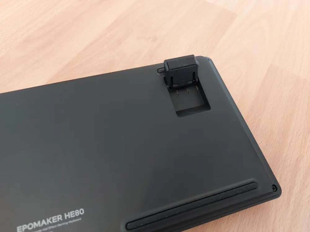 Die Tastatur ist durch das Kunststoffgehäuse recht leicht, sitzt aber dennoch stabil auf dem Tisch. Zwei Füße auf der Unterseite erlauben den Winkel in zwei Stufen zu verstellen. Die Verarbeitung ist gut, nichts klappert oder knarzt.