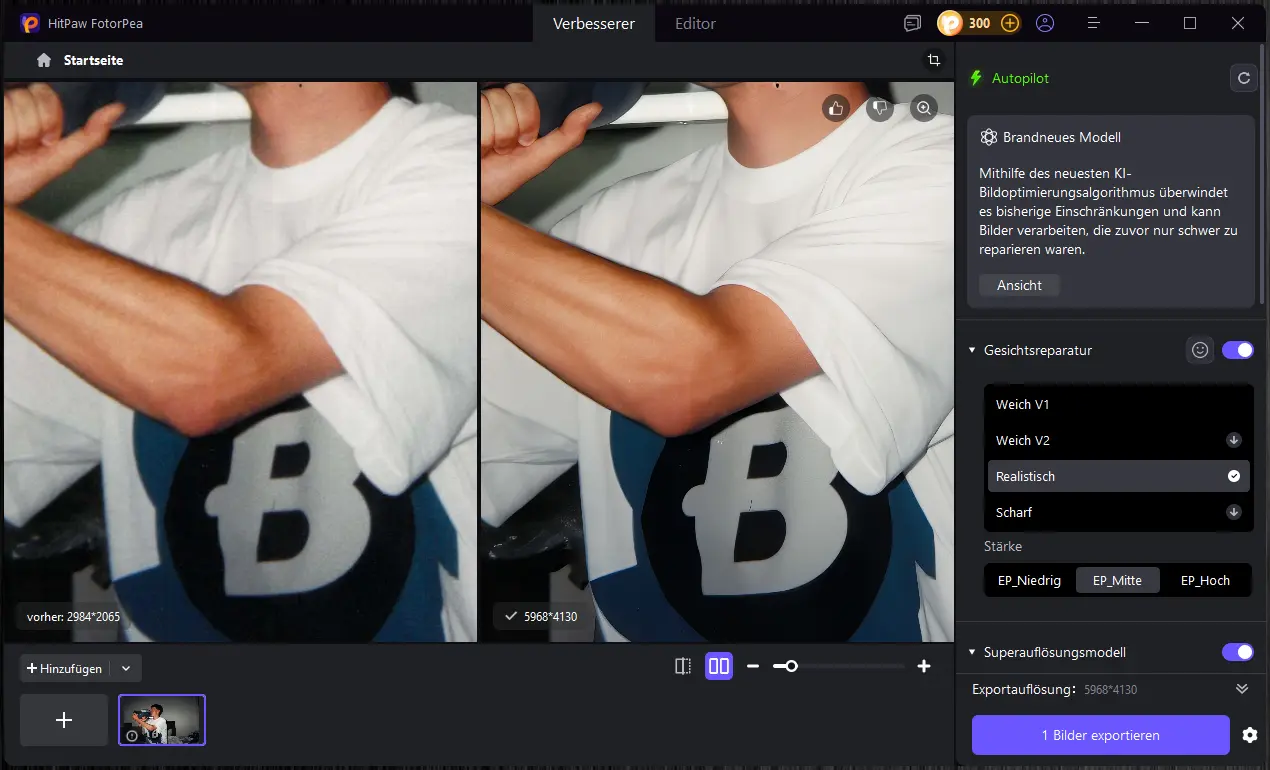 HitPaw FotorPea macht es leicht, Bilder mit wenigen Klicks deutlich zu verbessern oder kreativ zu verändern. Besonders stark sind die Funktionen zur Restaurierung und Aufwertung älter Aufnahmen sowie das Hochskalieren von Bildern. Kleinere Schwächen gibt es beim Entfernen von Objekten und bei der KI-Bildgenerierung, wo nicht immer perfekte Ergebnisse entstehen.