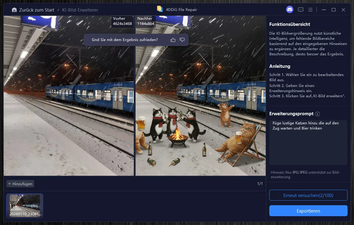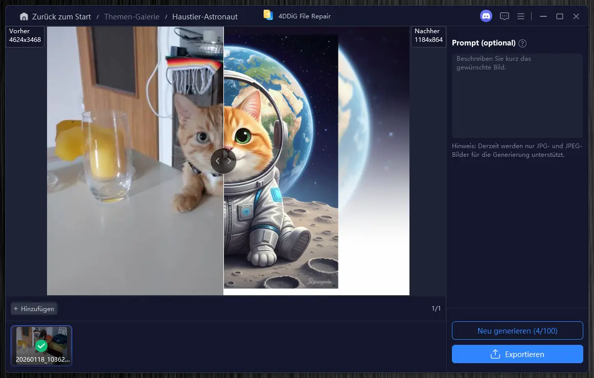 • Rettungs-Bonus: Da es Teil von File Repair ist, kannst du gleichzeitig die Qualität von alten, unscharfen Urlaubsfotos massiv anheben (Upscaling auf 4K).