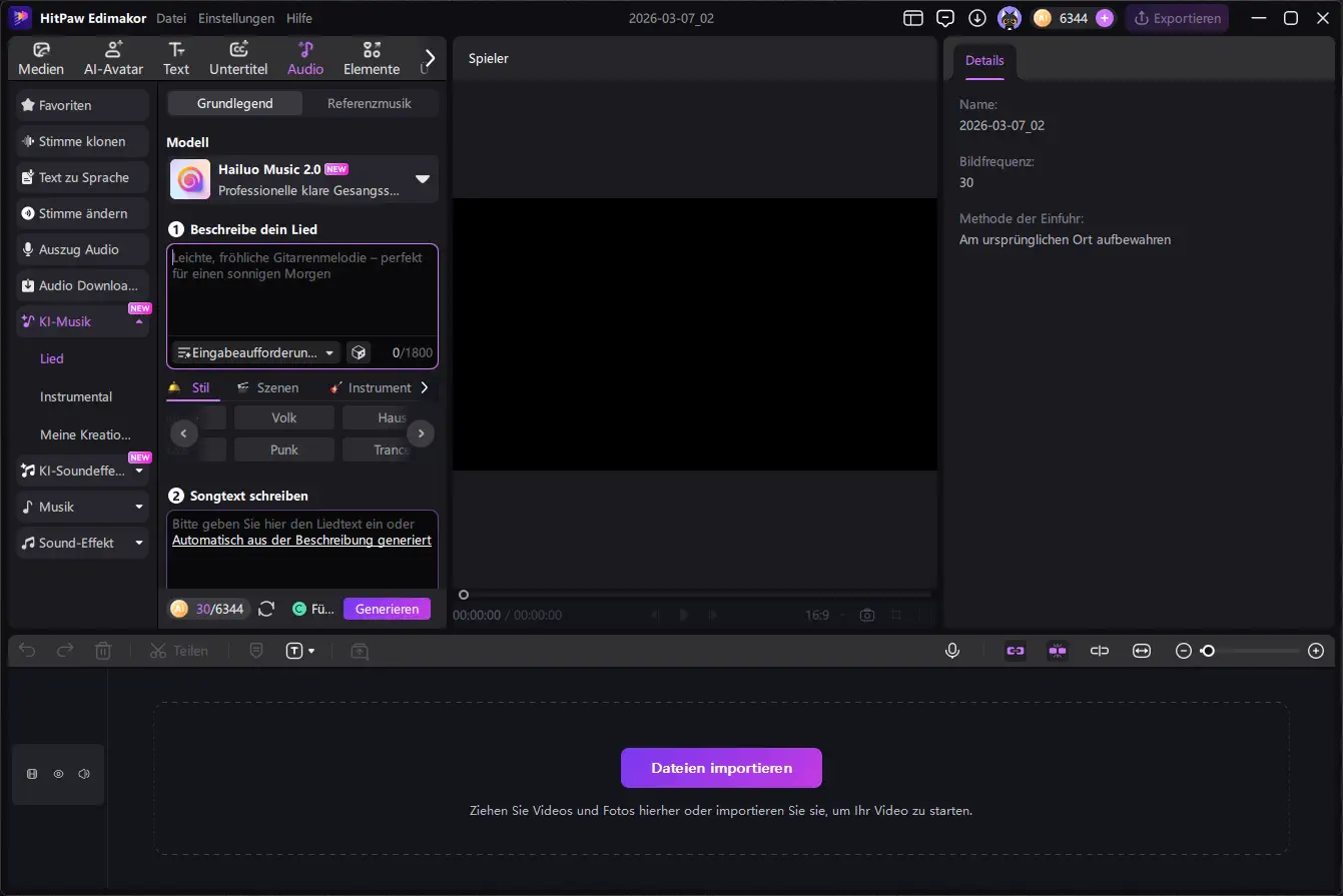 Für diesen Artikel verwenden wir eine Software, die verschiedene KI-Funktionen rund um Medienproduktion kombiniert. Neben der automatischen Erstellung von Musik bietet das Programm auch weitere AI-Tools, etwa für Videobearbeitung, Text-zu-Sprache, Untertitel oder andere kreative Anwendungen.