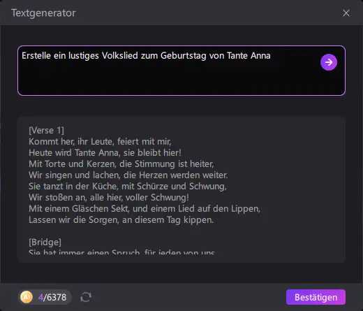 Neben der Musikgenerierung bietet die Software auch eine Text-zu-Sprache-Funktion (Text-to-Speech). Damit lassen sich aus geschriebenem Text automatisch gesprochene Audiospuren erzeugen, die beispielsweise als Voice-over für Videos, Präsentationen oder Tutorials verwendet werden können.