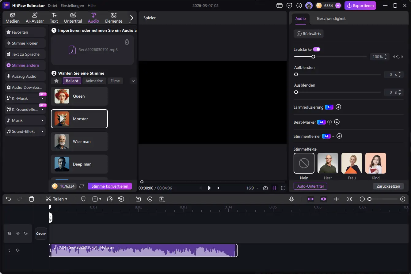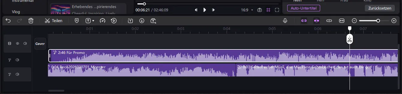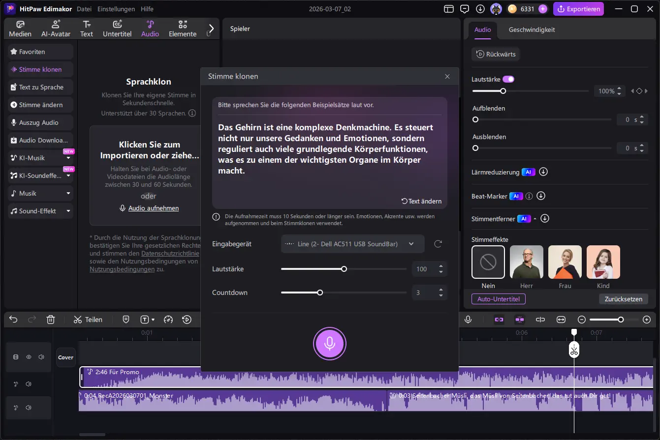 Nachdem eine passende Stimme ausgewählt wurde, erzeugt die Software automatisch eine Audiodatei aus dem eingegebenen Text. Diese wird direkt in das Projekt eingefügt und kann anschließend wie jede andere Tonspur bearbeitet werden.