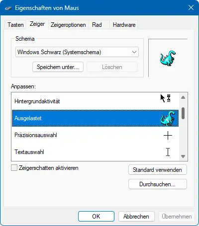 Unter „Zeiger“ können wir auf „Durchsuchen“ klicken und jetzt den Dino auswählen.