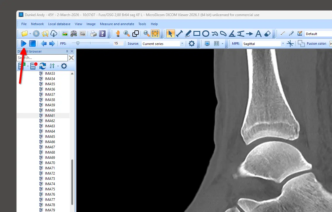 Beim Ct können wir den Play-Button drücken und so die Animation anschauen und an den Stellen stoppen und etwas erkennen oder nicht.
