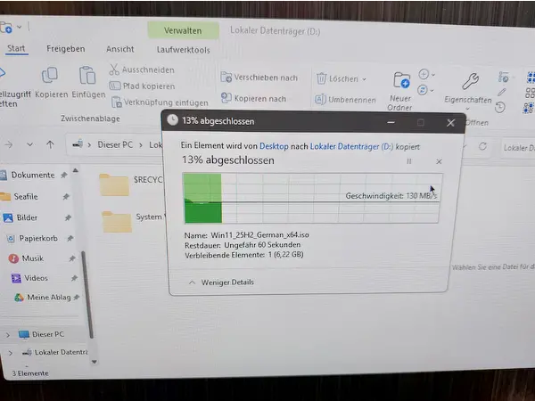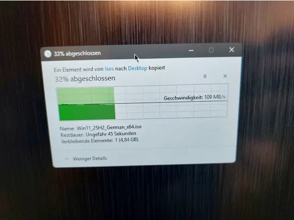Natürlich hat mich auch die Datenübertragung interessiert. Auch hier kann ich nicht das volle Potenzial testen. Netzwerk ist bei mir, durch den Router, auf 100 Mbit begrenzt, was locker erreicht wird.
