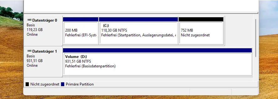 The starting point in disk management is a classic scenario: while the system drive (C:) with only 118 GB is already bursting at the seams, disk 1 (D:) with almost 1 TB offers plenty of free storage space.