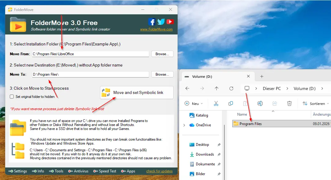 Folder Move solves this bottleneck by physically moving installed folders to the large drive and creating a symbolic link at the old location. This serves as a digital signpost: the system continues to think that the files are located on C:, allowing all programmes to continue running smoothly without reinstallation, while immediately relieving the system drive.
