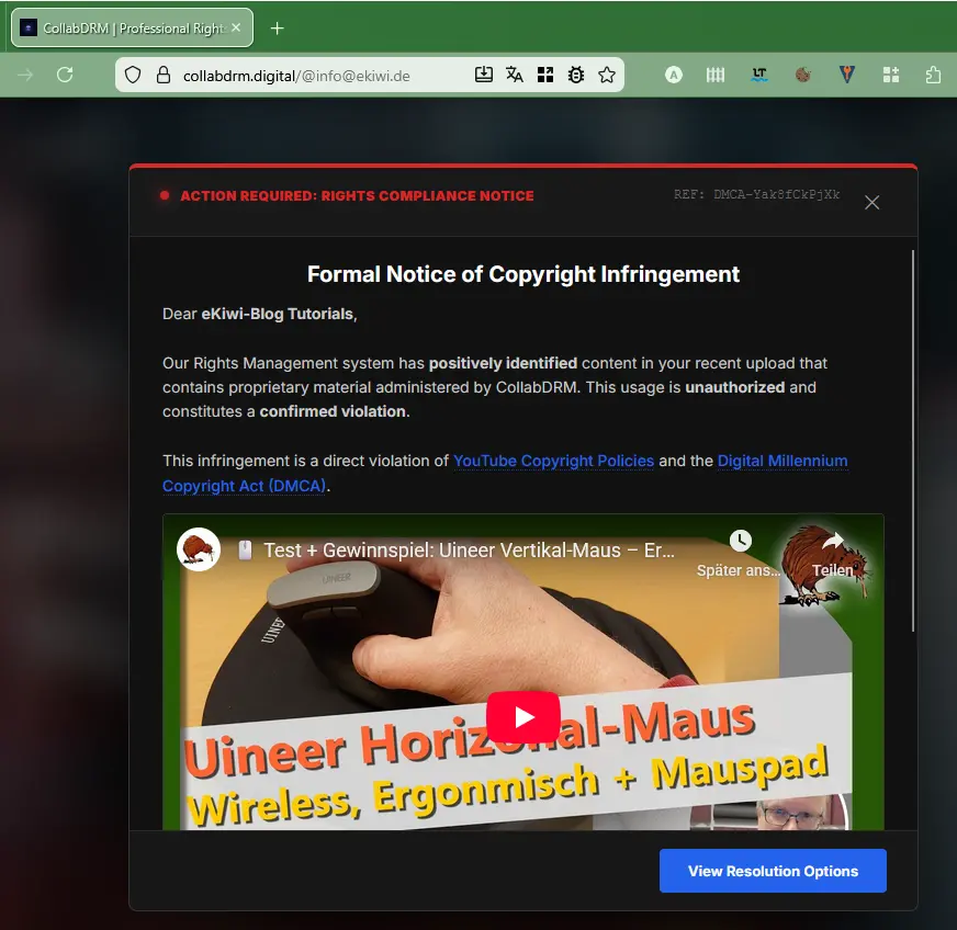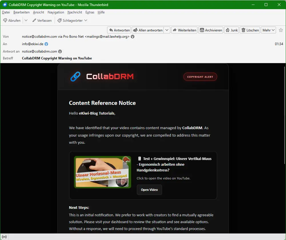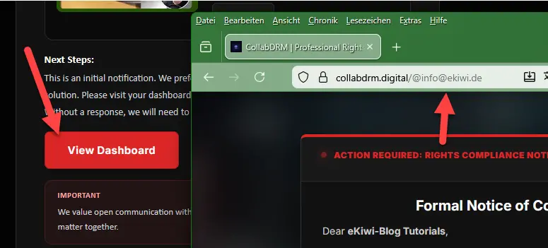- Targeted intimidation: The topic of “copyright infringement” puts pressure on users to act quickly and rashly in order to protect their own channel.