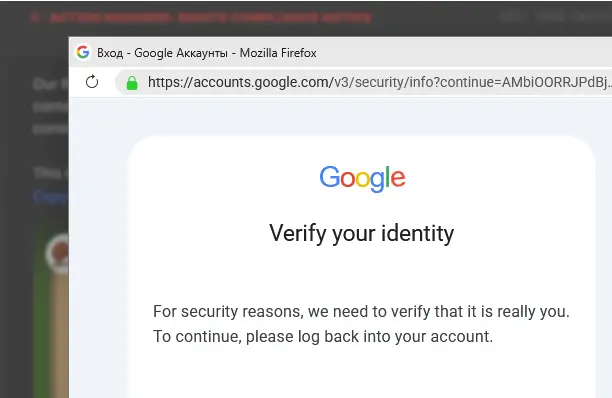 There is a link on the page; if we click on it, a supposed Google login window opens. The Russian script in the title is a definite cause for suspicion. Otherwise, it’s well done: our browser is recognised, the address bar shows Google, there’s a green padlock – everything’s fine, right?
